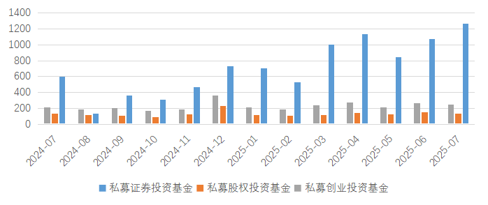 7月随着市场情绪升温,私募证券投资基金发行数量同比翻倍。私募证券投资基金发行1268只,环比增加近20%,同比增加110%。私募股权投资基金发行131只,环比减少11%,同比减少4%。私募创业投资基金发行245只,环比减少6%,同比增加15%。