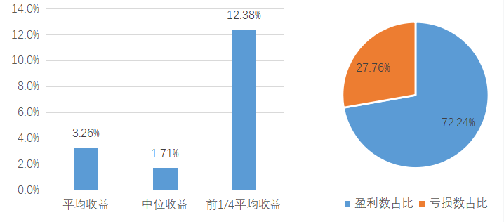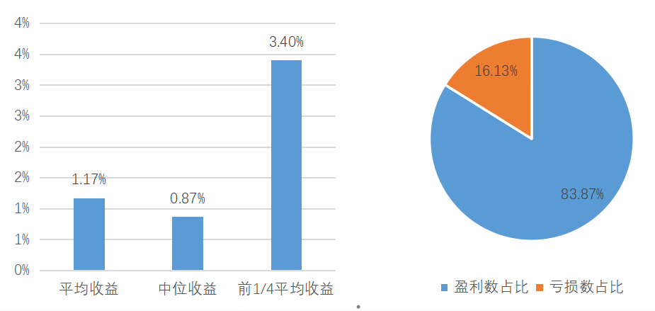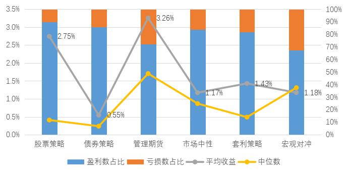 波动率:7月,截面波动率上升但时序波动率下降,相对利于截面类策略。基差:基差水平持续收敛,平均年化基差成本,IC约-11%,IM约-13%,中性策略环境有所改善。7月市场中性策略平均收益为1.17%,前1/4平均收益3.40%,约84%的产品获得正收益。市场中性策略7月收益分布及盈亏状况,数据来源:朝阳永续研究院,数据截至2025/7/317月大宗商品整体上涨,但分化较大。Wind商品指数月度涨幅1.58%,其中非金属建材及黑色领涨;有色板块下跌。分品种来看,双焦、玻璃、碳酸锂等反内卷品种涨幅较大,而欧线、农产品板块内多个品种领跌。受“反内卷”政策影响,管理期货各策略之间的表现分化明显。早在2024年7月底,中央政治局会议就明确提出“强化行业自律,防止‘内卷式’恶性竞争。” 今年7月份以来,“反内转”政策开始加速推进,加大了大宗商品的波动。7月25日当周,非金属建材、煤焦钢矿等商品板块大幅拉升。不过随后监管层出手为市场降温,各商品板块又有所回调。从管理期货各类策略表现上来看,趋势策略,尤其是中短周期趋势策略,在7月第四周之前,即7月25日之前表现最为显著,而持仓周期较长的趋势策略反应较慢,但是依旧有较好表现。相反,商品市场整体上出现了一定的强弱反转,导致截面多空类策略表现较弱。在7月第四周之后,商品各板块出现降温回调,大部分趋势类管理期货出现大幅度收益回吐,相较而言短周期趋势策略影响较小,而截面策略有回升。相较于商品,股指走势相较于前两个月波动率大幅度收窄,股指策略整体表现平平略有下降。整体来看,7月大宗商品市场在“反内卷”政策强力驱动下呈现冲高回落格局,整体波动剧烈。政策预期迅速推升相关受益品种价格,为管理期货策略创造了良好的盈利环境。随着市场风险偏好回落,前期涨幅面临回吐压力,行情显著分化。当前核心矛盾在于高涨的政策预期进入实质验证期,与疲弱基本面持续拉锯。后市聚焦三大关键验证点:中美关税谈判进展、政策落地强度及效果、国内经济修复情况。在预期高波动与品种分化延续的市场中,能够系统性捕捉多资产价格趋势、并有效管理双向风险的策略框架,其配置价值持续显现。7月的管理期货基金平均收益率为3.26%,中位数收益率为1.71%,前1/4平均收益率为12.38%。其中,有约72.24%的管理期货基金产品在7月获得正收益。管理期货策略7月收益分布及盈亏状况,数据来源:朝阳永续研究院,数据截至2025/7/317月,宏观策略部分盈利。根据朝阳永续统计的宏观对冲基金数据,7月份的平均收益率为1.18%,中位数收益率1.31%,前1/4平均收益率6.71%。其中,约67.25%的宏观对冲策略产品获得正收益。宏观对冲7月收益分布及盈亏状况,数据来源:朝阳永续研究院,数据截至2025/7/31