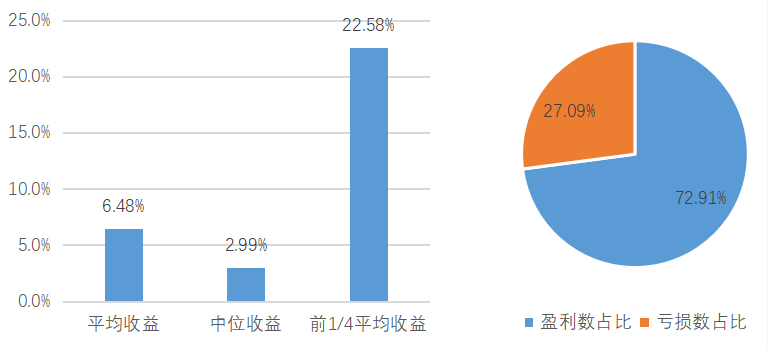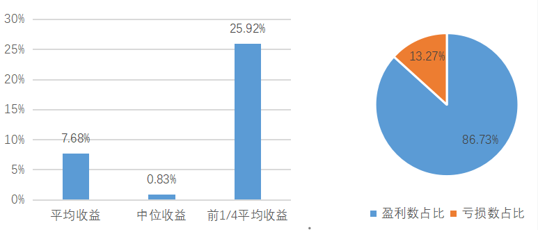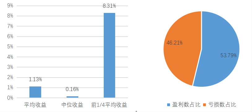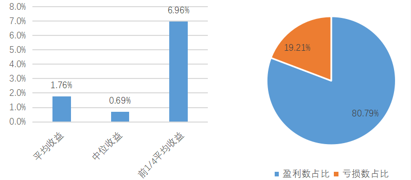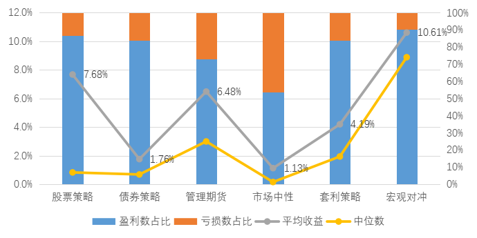 百亿私募混合指数与沪深 300 指数,数据来源:朝阳永续研究院,数据截至2025/9/30各策略3季度平均业绩表现,数据来源:朝阳永续研究院,数据截至2025/9/30三季度股票市场大涨。主要规模指数中,中证500涨幅最为显著,前期积累了较大涨幅的中证2000在9月显露疲态。低迷多时的双创连续三个月表现亮眼。两市日均成交额逐月上升,于9月超过2.3万亿元。板块上,AI、创新药先延续强势,随后向半导体、新能源扩散,随着美国降息预期上升,有色板块于9月下旬表现强劲。风格上,成长好于价值、红利。股票策略三季度平均收益为7.68%,中位数为0.83%,排名前1/4的产品平均收益为25.92%。统计的19088只产品中,约86%的产品收益为正。股票策略3季度收益分布及盈亏状况,数据来源:朝阳永续研究院,数据截至2025/9/30三季度,尽管市场交投火热,基差成本下降,但8、9月份市场都呈现出指数涨幅大于指数成分股中位数(以较多指增产品对标中证1000指数为例),大于全市场中位数的现象,且双创涨幅显著,异常的市场结构令量化策略难以获得超额收益。成分股持仓占比高、持仓较为集中、双创占比高的产品在此期间表现较好。三季度市场中性策略平均收益为1.13%,前1/4平均收益0.16%,约50%的产品获得正收益。市场中性策略3季度收益分布及盈亏状况,数据来源:朝阳永续研究院,数据截至2025/9/30三季度,大宗商品市场呈现出震荡微涨的情况,南华商品指数涨幅为3.66%,涨幅主要由南华贵金属和南华金属带动,分别季度涨幅为17.44%和3.24%,表现较差的为南华农业,季度下跌-1.14%。反观股指期货,延续第二季度的表现,整体呈现出高波动高涨幅的情况,其中,中证500主连季度上涨30.87%,中证1000主连,沪深300主连和上证50主连分别涨幅25.26%, 20.17%, 11.46%。国债期货表现相反于股指期货,整体下跌,其中30年期国债主连季度下跌-5.36%。管理期货策略中,表现较为亮眼的是股指类策略,整体涨幅显著高于其余类策略,主要原因在于股指期货的较大波动率和涨幅。与此相反,由于海内外宏观政策的变化,导致部分商品的基本面表现偏离实际情况,高度依赖商品基本面的管理期货主观策略第三季度普遍较差。管理期货大宗商品类策略中,趋势类策略表现显著优于截面策略,截面策略受“反内卷”政策的推进和降温,部分产品出现了明显的较大反转行情,导致品种的趋势不连续,截面分化反转和缩小,截面策略表现较差。而大宗商品的趋势策略,尤其是短期趋势类策略,对价格波动较为敏感,虽然也受“反内卷”政策的影响,但是较为有限,可以在较小波段捕捉趋势,因此表现显著。量化复合类管理期货兼顾各类策略,综合表现优越。三季度管理期货策略平均收益率为6.48%,中位数收益率为2.99%,前1/4平均收益率为22.58%。其中,有约72.91%的管理期货基金产品在第三季度获得正收益。管理期货策略3季度收益分布及盈亏状况,数据来源:朝阳永续研究院,数据截至2025/9/30三季度,宏观策略大部分盈利。根据朝阳永续的统计,三季度该策略的平均收益率为10.61%,中位数收益率 8.88%,前1/4平均收益率25.78%。其中,约90.15%的宏观对冲策略产品获得正收益。宏观对冲3季度收益分布及盈亏状况,数据来源:朝阳永续研究院,数据截至2025/9/30