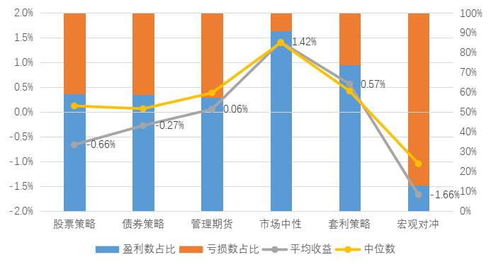 股票策略11月收益分布及盈亏状况,数据来源:朝阳永续研究院,数据截至2025/11/3011月中性策略平均表现好于其他策略,11月也是中性策略今年以来表现较好的月份,或得益于小市值因子再度好转,以及上升的截面波动率。流动性:11月,换手率和成交额均有所下降,但仍处于高位,有利于量价类策略。波动率:11月,截面波动率上升,时序波动率下降,利于截面类策略,不利于T0策略。基差:平均年化基差水平略微扩大,IC约-11%,IM约-14%,基差环境与前月变化不大。风格因子:11月小市值风格强劲。今年以来,beta收益最高,紧接着是小市值风格。11月市场中性策略平均收益为1.42%,前1/4平均收益2.98%,约91%的产品获得正收益。市场中性策略11月收益分布及盈亏状况,数据来源:朝阳永续研究院,数据截至2025/11/3011月,大宗商品市场呈现出震荡微涨的情况,按照周度计算,南华商品指数涨幅为0.53%,涨幅主要由南华贵金属贡献,涨幅为6.24%,表现较差的为南华能化,下跌-2.32%,南华农业由负转正,上涨0.75%。从品种来看,碳酸锂延续上月强势,月涨幅16.96%。部分农产品也在该月出现反弹,黄玉米上涨5.36%,玉米淀粉上涨5.17%。相反,双焦上月出现了较大跌幅,焦煤下跌-17.03%,焦炭下跌-11.39%。反观股指期货,上月涨幅相较于10月出现了“熄火”的下跌走势,同时,各股指出现了波动率下降的现象,市场情绪趋于谨慎。跌幅最多的为IC主连,11月跌幅为-3.7%,其次是IF主连,跌幅为-2.71%,IH,IM分别跌幅为-1.73%,-1.45%。国债表现类似于股指期货,TL,T,TF,TS分别跌幅为1.73%,-0.53%,-0.4%,-0.11%。策略层面,11月由于股指期货的熄火,导致交易股指期货的部分策略表现不佳,尤其是趋势跟踪类策略回撤明显。由于政策的持续发力点聚焦于消费端升级与产业协同,量化基本面和量化截面策略取得较好收益。复合类策略在消费主线与产业协同的共振下,兼顾趋势行情与基本面因子的多维度模型展现出更强适应性。11月的管理期货基金平均收益率为0.06%,中位数收益率为0.39%,前1/4平均收益率为4.13%。其中,有约57.51%的管理期货基金产品在11月获得正收益。管理期货各类策略的综合表现,呈现出:量化基本面策略>量化截面策略>量化复合策略>主观策略>趋势策略>股指策略。管理期货策略11月收益分布及盈亏状况,数据来源:朝阳永续研究院,数据截至2025/11/3011月,宏观策略大部分亏损,平均收益率为-1.66%,中位数收益率-1.04%,前1/4平均收益率0.88%。其中,约13.27%的宏观对冲策略产品获得正收益。宏观对冲11月收益分布及盈亏状况,数据来源:朝阳永续研究院,数据截至2025/11/30