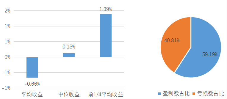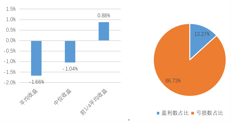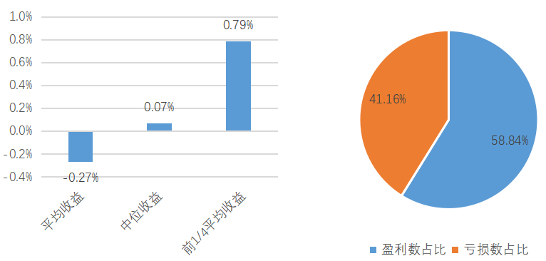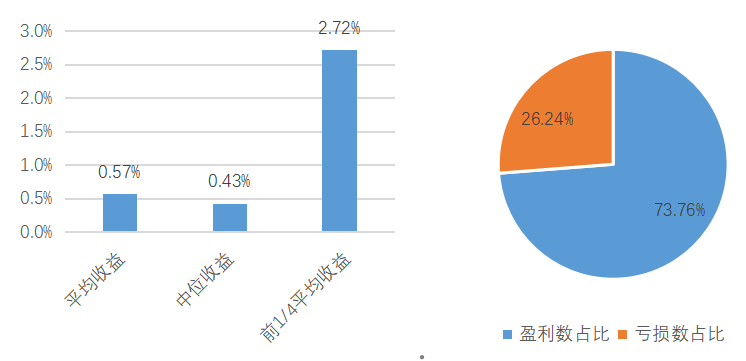 11月套利策略中高频套利和商品期权的排名靠前。11月商品的隐含波动率有所下降,有利于商品期权卖方的策略环境。期权:11月金融期权隐含波动率整体有所下降,尤其在11月21日后快速下降。11月末,中证1000的20日历史波动率相较于10月末有所下降,上证50的20日历史波动率也有所下降。由于11月金融期权隐含波动率有所下降,金融期权卖方处于较好的策略环境。11月商品期权隐含波动率整体震荡下降。高波动品种,中波动品种和低波动品种的走势大致类似,整体在11月上旬有所下跌,而后在11月11日至11月21日有所上升,21号后继续下跌。由于11月商品隐含波动率整体有所下降,商品期权卖方处于较好的策略环境。可转债:11月,转债市场先上升后下降,截止月底,转债价格水平较10月末有略微下降。11月转股溢价率在11月21日出现大幅上涨,原因可能是当日股票市场出现大幅下跌,转债市场价格也下跌但幅度没有股票市场剧烈导致。截至11月末转股溢价率中位数为29.8%。95-135元可转债对应正股20日历史波动率维持在低位震荡,截至11月末波动率为32.00%,在均值减标准差线附近偏上的位置。11月转债交易热度先震荡上涨后震荡下跌,转债市场总成交额截至11月末约为651.80亿元。11月末转债估值与10月末持平,自2018年以来目前转债估值处于偏高的位置。11月套利策略基金平均收益率为0.57%,收益率中位数为0.43%,前1/4平均收益为2.72%,73.76%的套利策略基金获得正收益。套利策略11月收益分布及盈亏状况,数据来源:朝阳永续研究院,数据截至2025/11/30